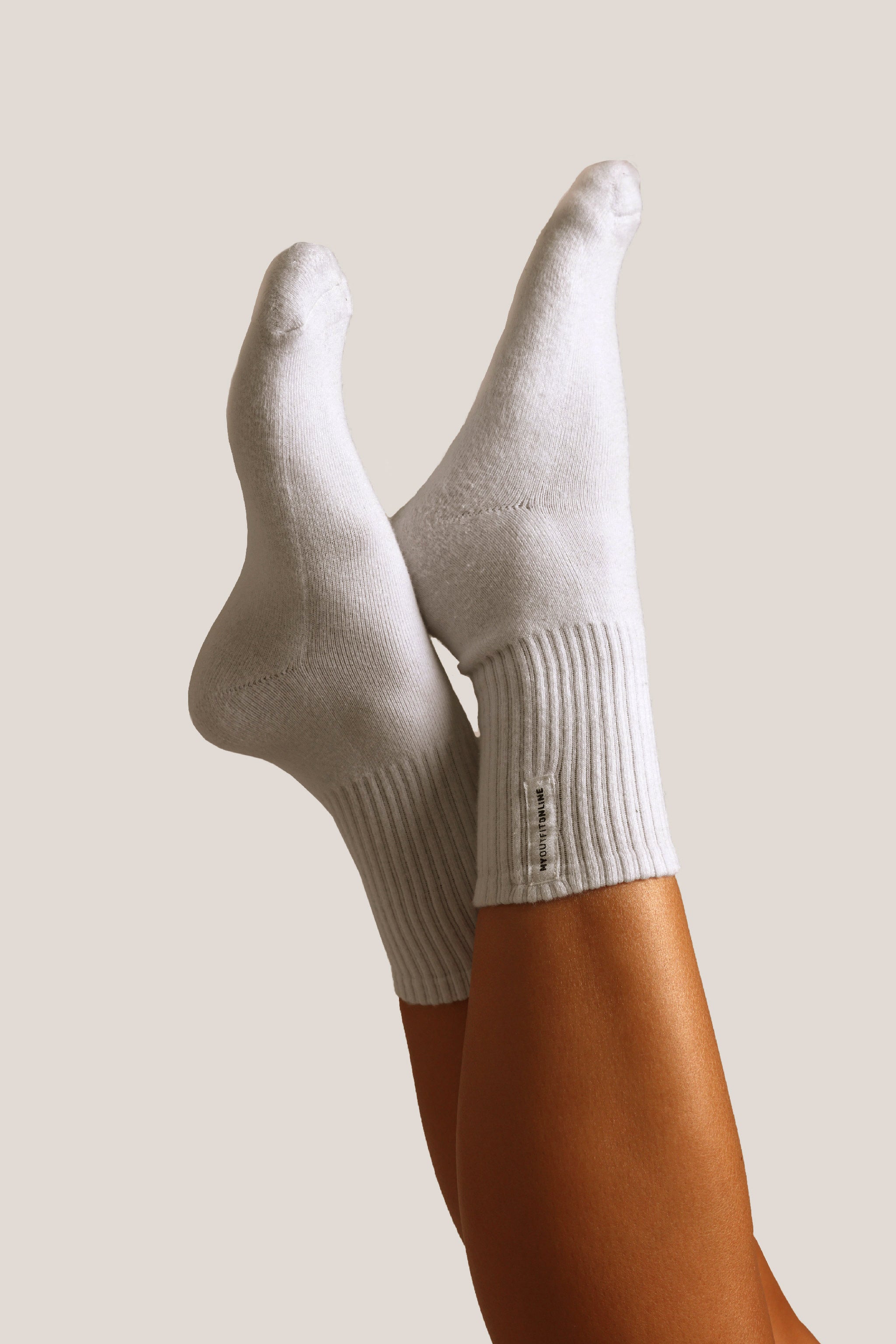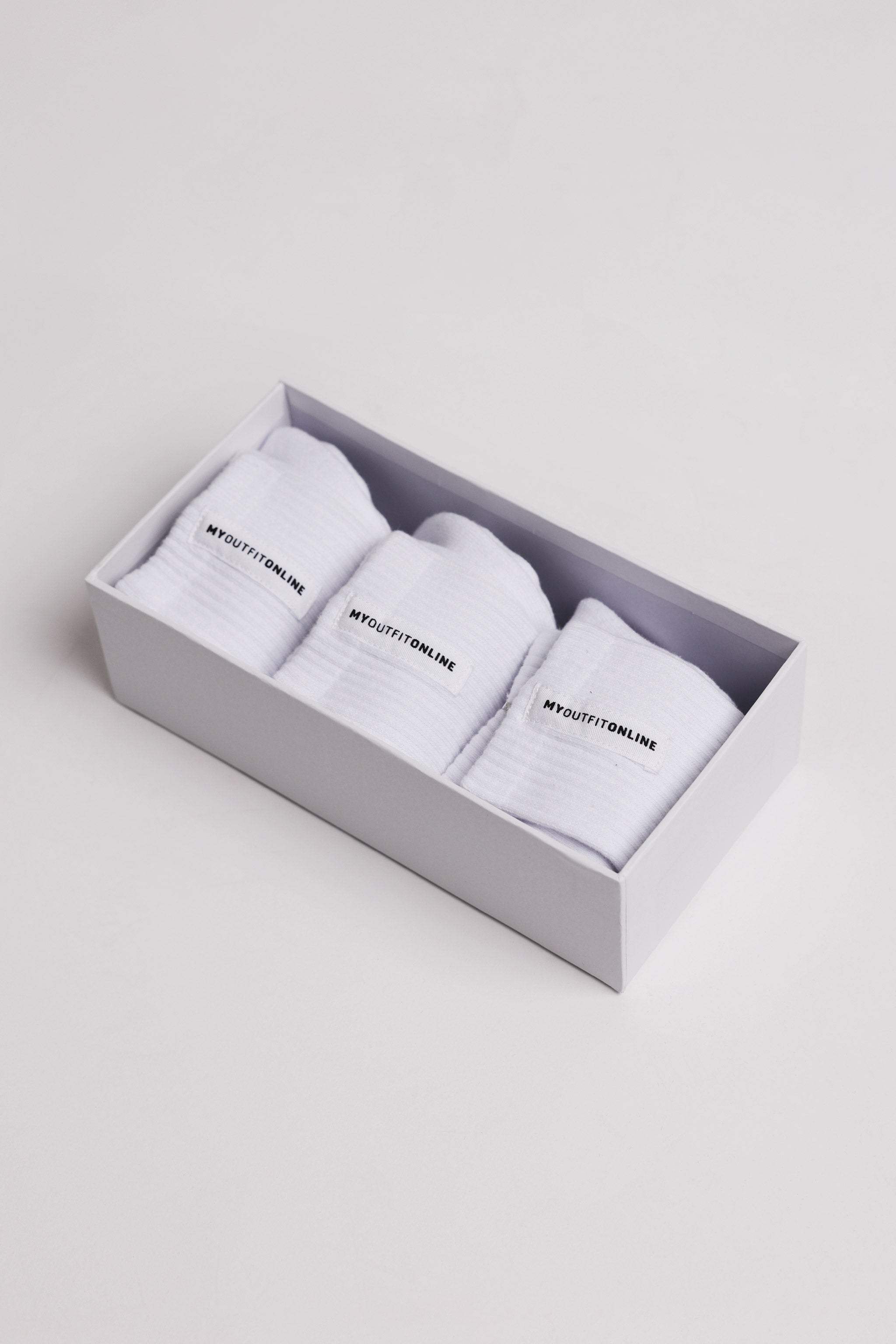 The Classic Crew Socks (3-pack) were designed to be durable with a cushioned sole. It features a vertical patch with the MY OUTFIT ONLINE logo.