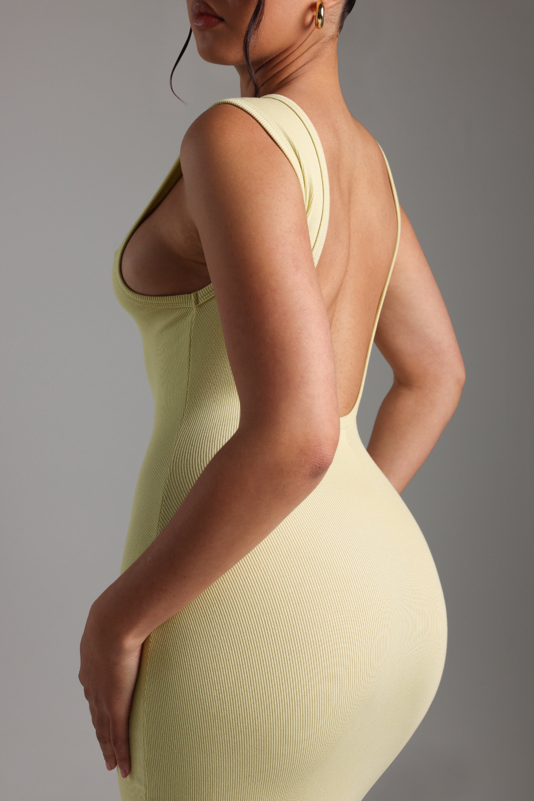 Highlights: single lined, vertical ribbed pattern, boat neckline, deep drop back