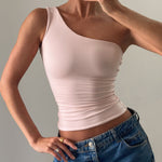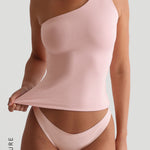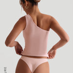 The One Shoulder T-Shirt features an exposed right shoulder for a touch of femininity, with a single strap and fabric that supports all chest sizes. This full-length top can be tucked in or left out, maintaining its seamless, flattering silhouette. Crafted from a fabric that gently cinches while feeling incredibly soft, it’s the perfect balance of comfort and elegance for everyday wear.