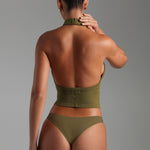 Highlights: double lined, vertical ribbed pattern, breathable, sweat wicking, hook and eye closure, halter neckline, deep back drop