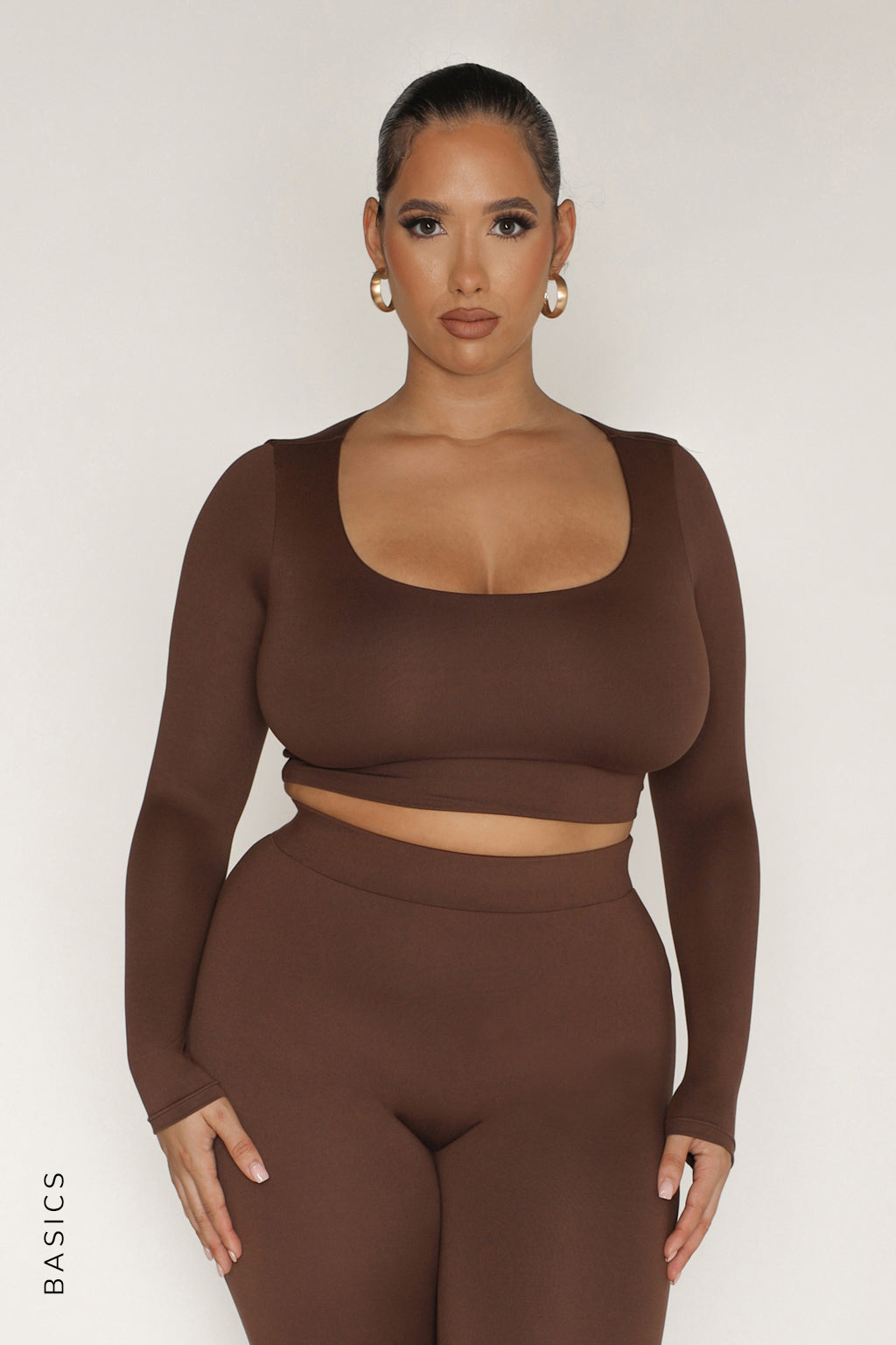 Round Neck Long Sleeve Crop Top Cropped long-sleeve top featuring a rounded neckline. This double layered top is made with our signature fabric and is designed to be soft and body-sculpting, making it a versatile yet essential wardrobe staple.