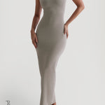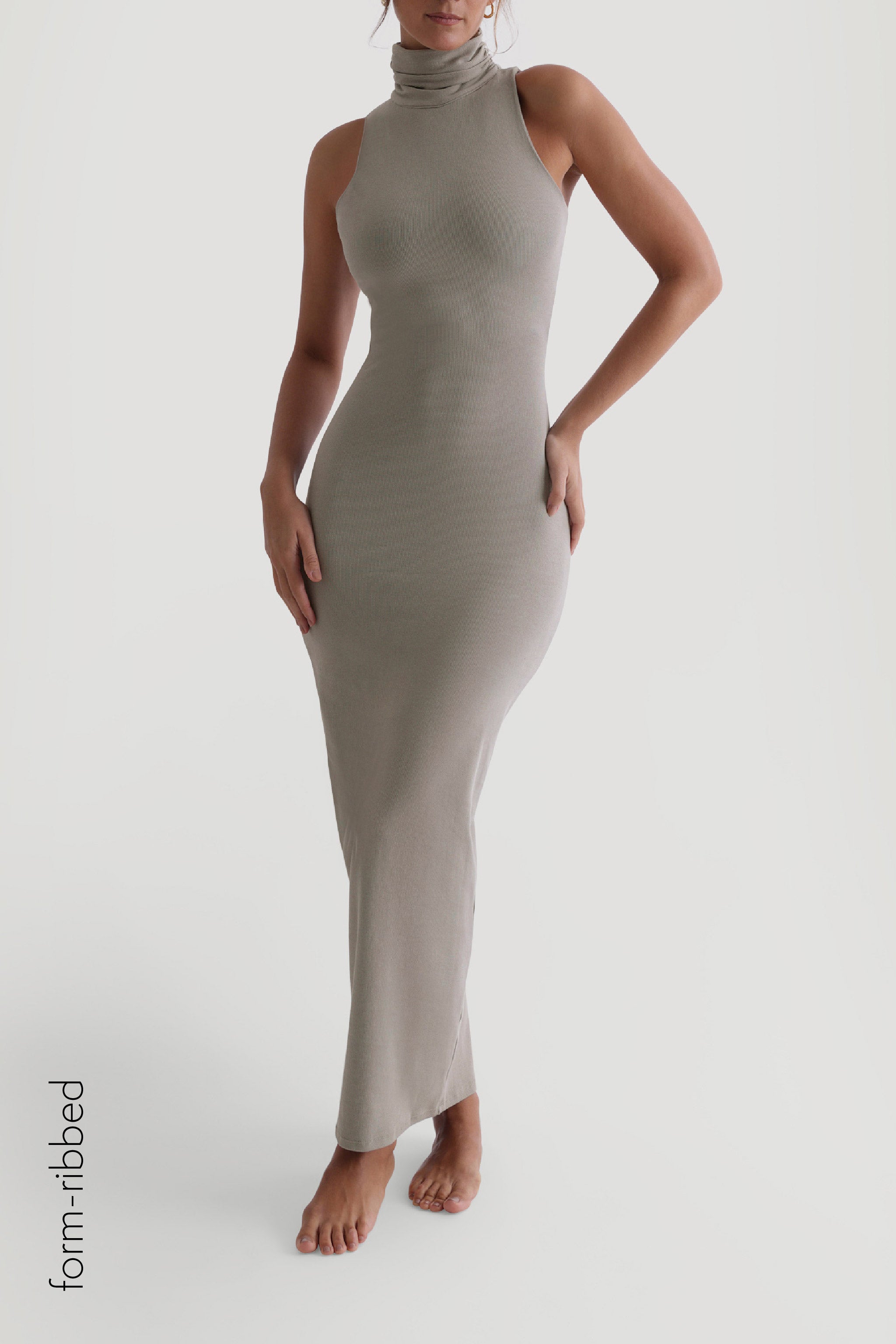 The Sleeveless Turtleneck Form-Ribbed Maxi Dress features a thoughtfully engineered invisible, back zipper, designed to facilitate effortless dressing while preserving your hairstyle and makeup. It includes an inner chest lining for added support and coverage.