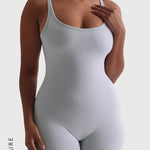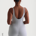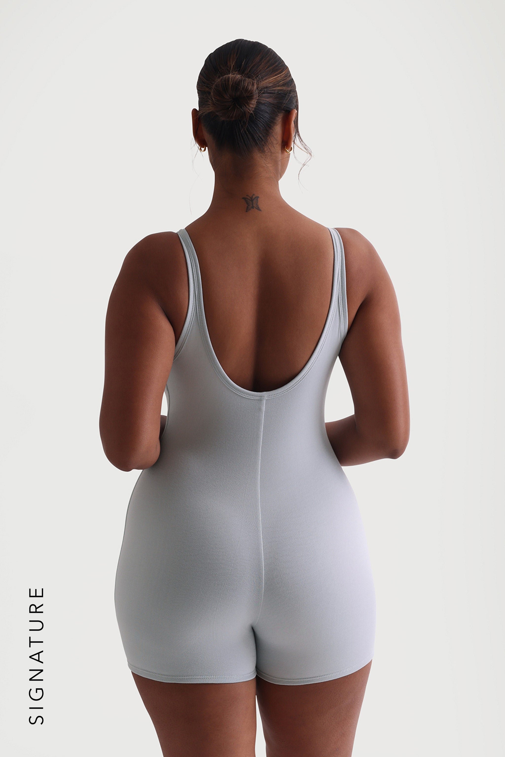 Der Banded Scoop Neck Romper wurde mit einem offenen Rücken entworfen, der den Rundhalsausschnitt ergänzt. Er verfügt über eine dünne Borte entlang des Ausschnitts für zusätzliche Details und Kontrast.