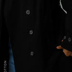 Highlights: double-breasted opening, balmacaan lapel, concealed button placet, tie closure