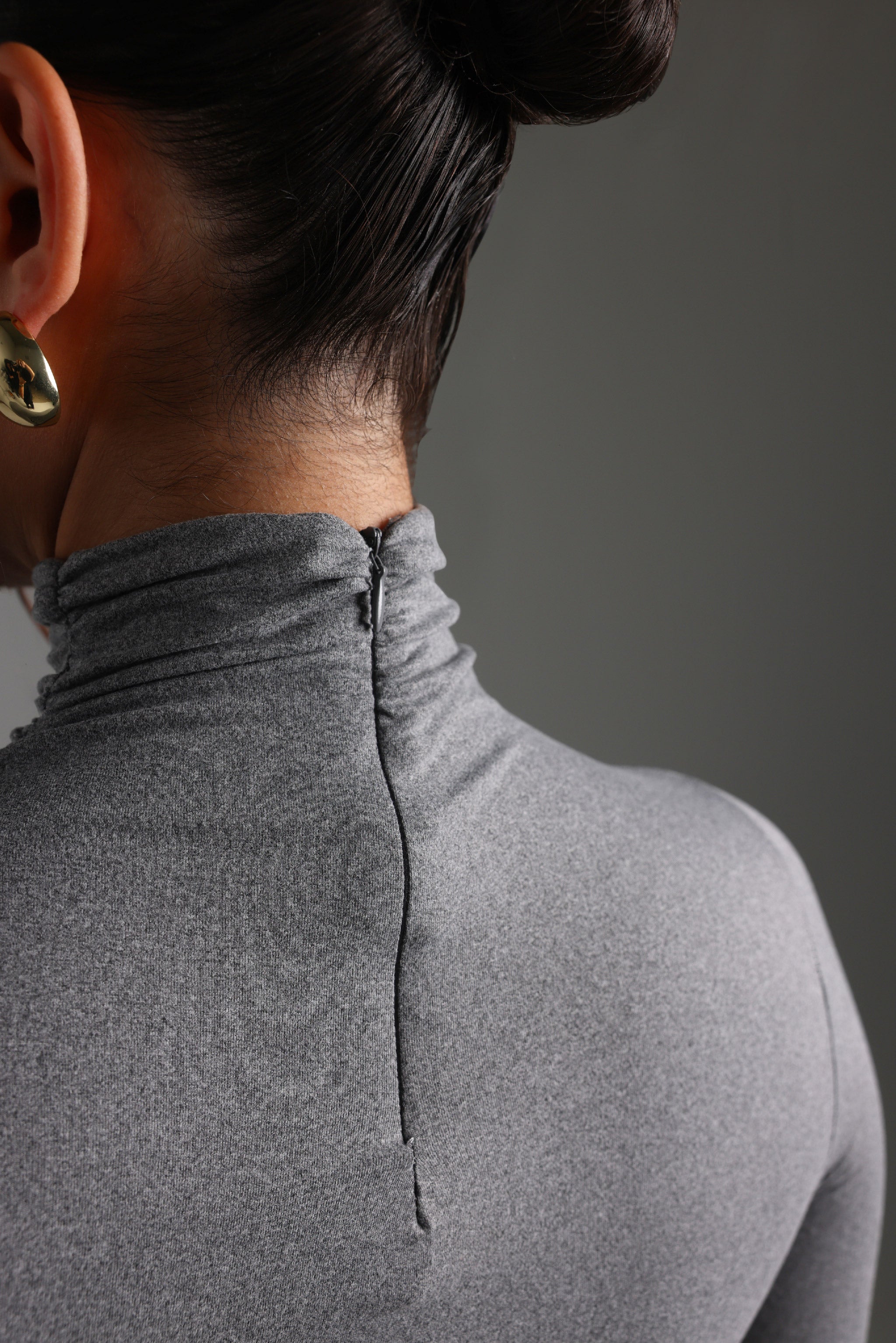 The Refined Long Sleeve Turtleneck T-Shirt features a thoughtfully engineered invisible, back zipper, designed to facilitate effortless dressing while preserving your hairstyle and makeup.