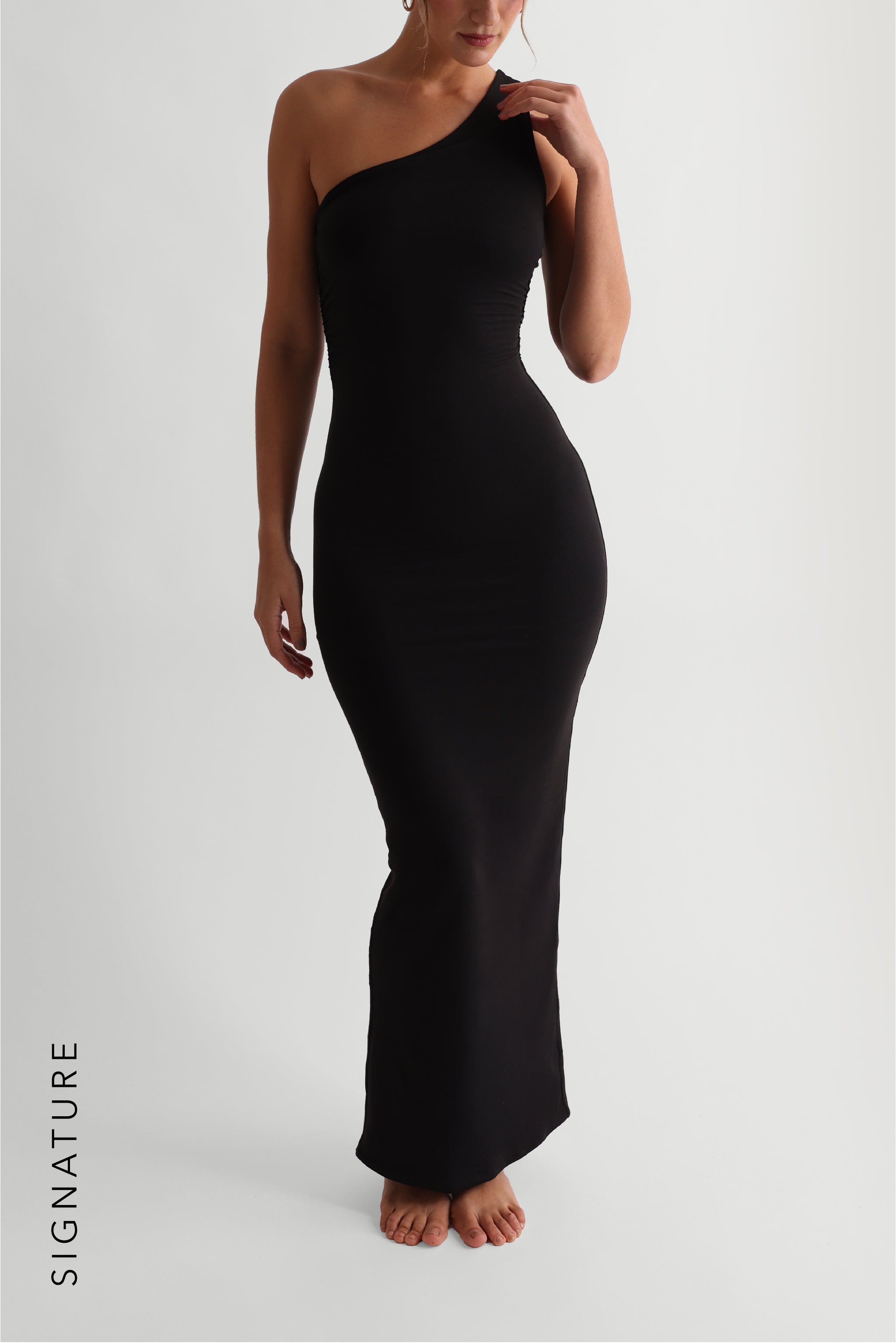 The One-Shoulder Ruched Maxi Dress features an exposed right shoulder and a single strap that flatters and supports all chest sizes. Crafted from our signature soft, sculpting fabric, it gently cinches while feeling weightless on the skin. With subtle ruching and maxi length, it’s the perfect choice for a memorable moment.