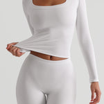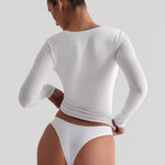 Fabriqué dans notre tissu signature pour un soutien supplémentaire, le T-shirt à manches longues en forme de U présente une bande d'un pouce le long de l'encolure échancrée pour flatter n'importe quelle taille de poitrine.