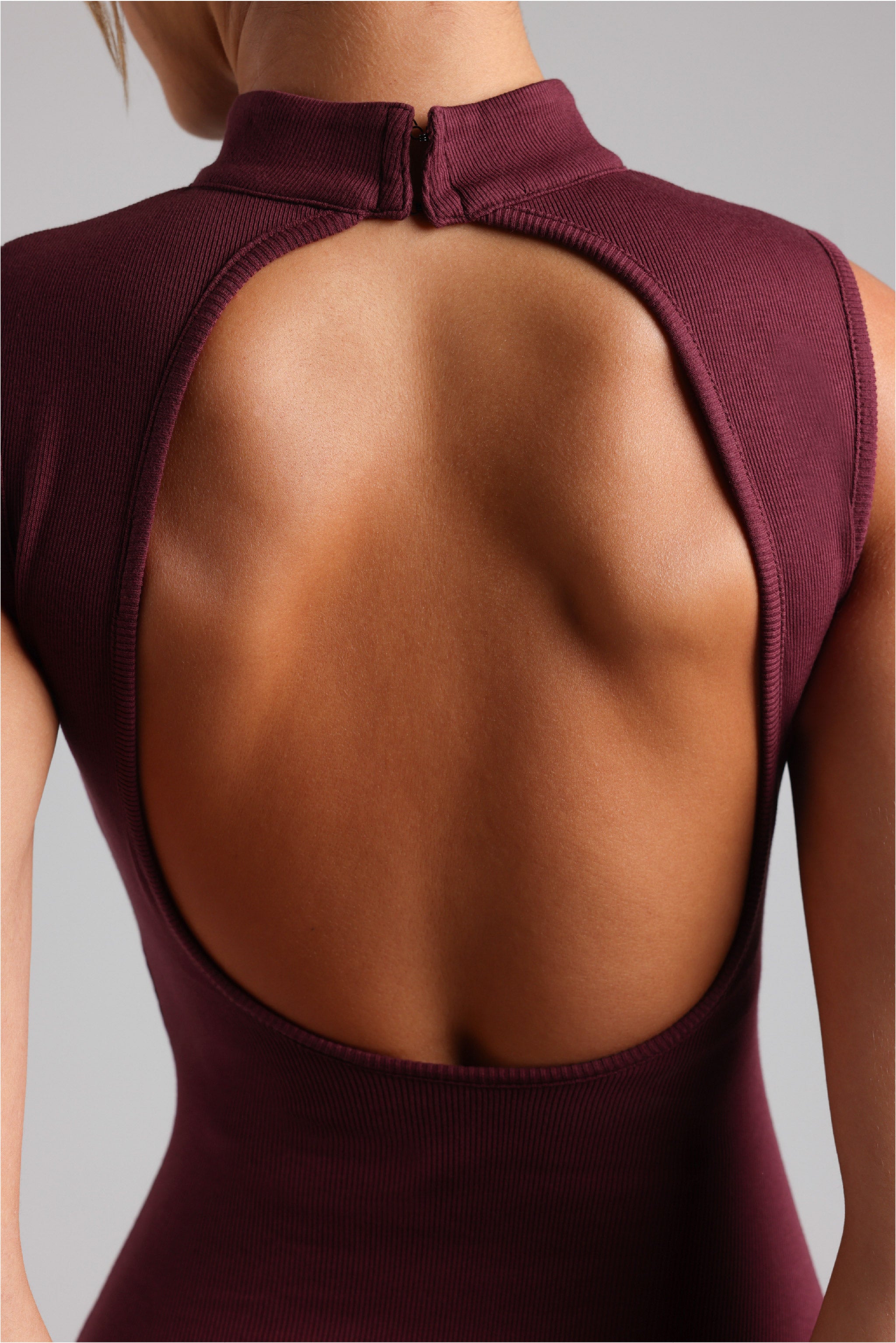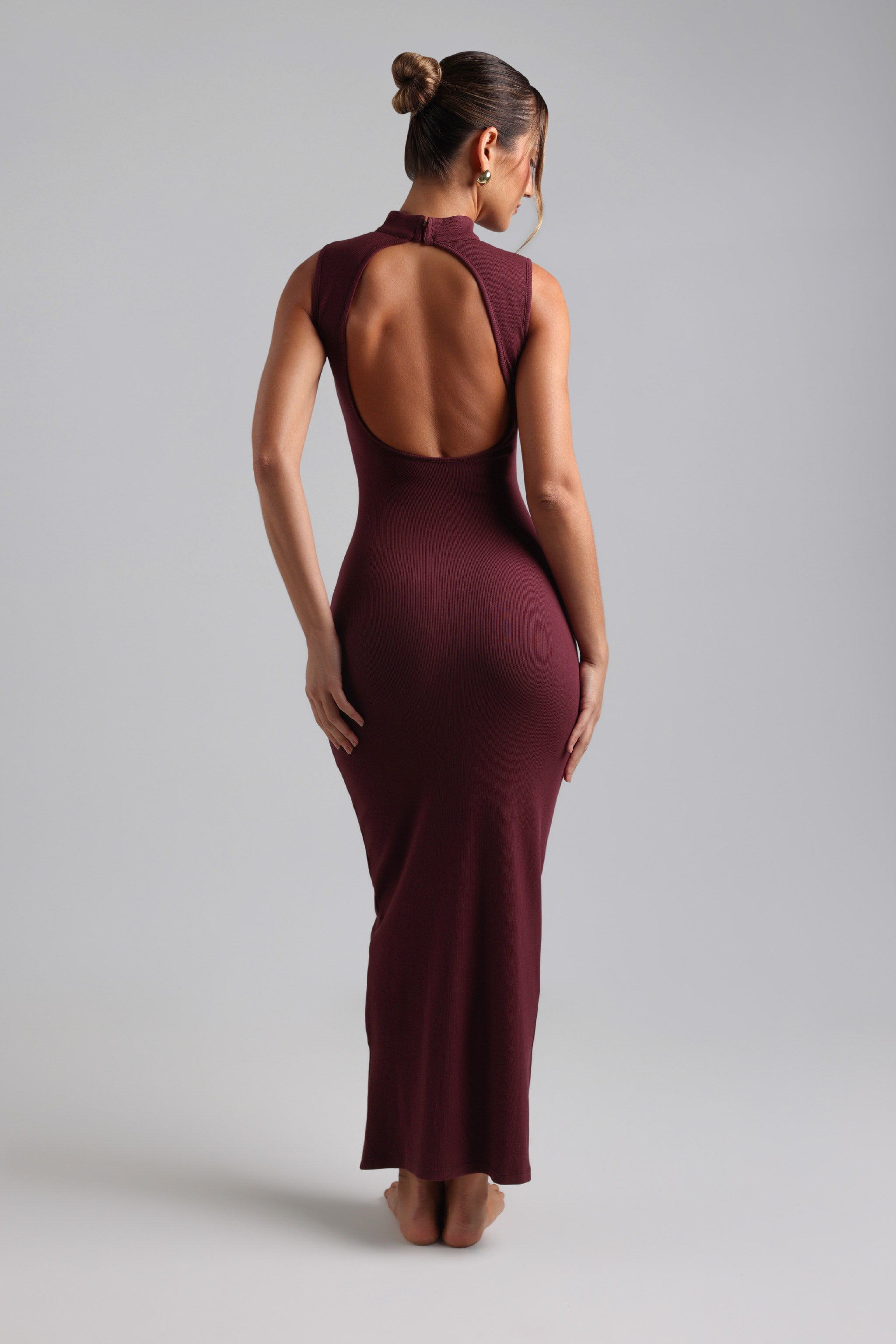 Sleek lines, soft texture, effortless presence. Our Sleeveless Mock Neck Maxi Dress pairs a sculpted mock neck with an open back in a ribbed fabric — introducing a bold note of modern femininity. Completed by an invisible back zipper, it moves with quiet grace and endless ease.