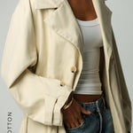 Highlights: double-breasted opening, oversized semi-notched lapel, tie closure